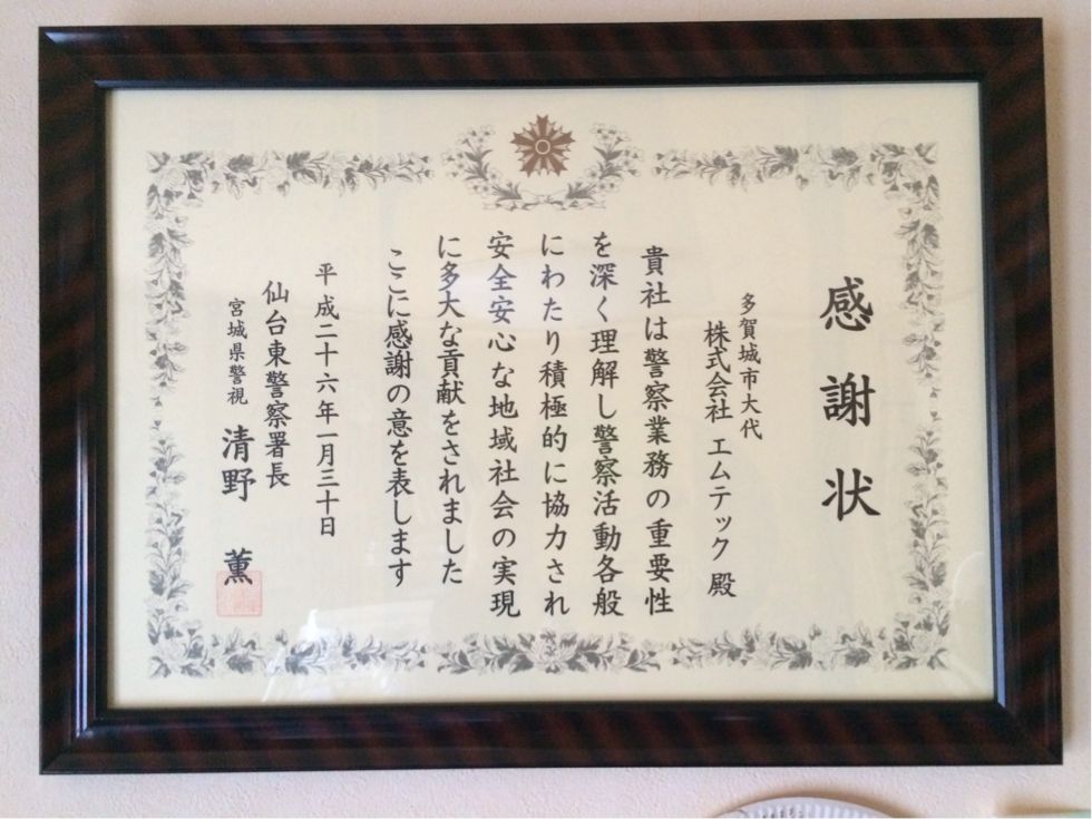 仙台東警察署様より感謝状を頂きました。